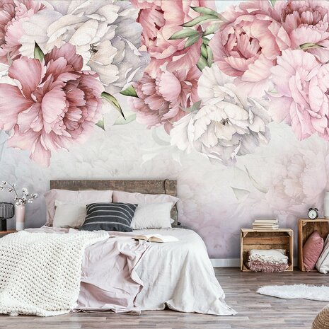 Dit Aquarel Pioenrozen behang heeft mooie rustige kleuren en geeft een romantische uitstraling.