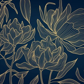 Bloemen fotobehang Wavy Flowers XL met mooie, grote mooie bloemen in een gouden lijnen, heeft een stijlvolle uitstraling en past goed in ieder interieur.