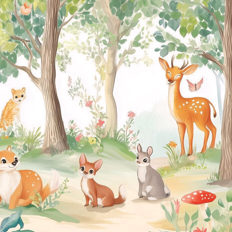 Geef de kinderkamer een unieke uitstraling met dit leuke Bosdieren fotobehang Woodland.