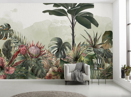 Dit Botanisch behang JungleSpot is een tropisch tafereel in verschillende lagen waardoor een dicht jungle-effect ontstaat. De lichte achtergrond laat de gedetailleerde groene en florale elementen meer opvallen. Perfect als je op zoek bent naar een stukje jungle in huis en tegelijkertijd een vrolijke uitstraling wilt creëren.