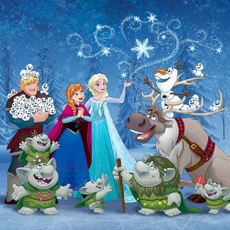Kristoff is geadopteerd door de trollen dus zij staan natuurlijk ook op dit Disney Frozen vlies behang All Family.