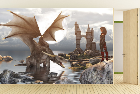 Dit fantasy Dragon Island fotobehang wordt gedrukt op vinyl behang van zware kwaliteit en is leverbaar in vijf standaard maten.