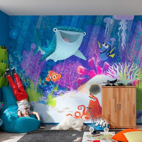 Finding Dory behang Aqua Party maakt van de kinderkamer een kleurrijke onderwaterwereld. Dory en haar vrienden zwemmen al vrolijk rond, kom jij ook?