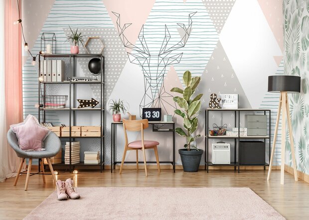 Dit Geometrisch behang Pastel en Hert staat mooi in iedere kamer.