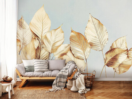 Geef de kamer een eigen stijl met dit Gouden bladeren fotobehang, leverbaar in diverse standaard maten.