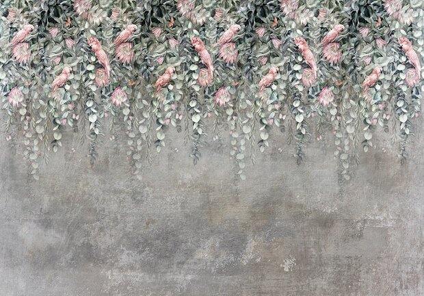 Het leuke Hangende bladeren fotobehang Kaketoe is leverbaar in diverse standaard afmetingen fotobehang.