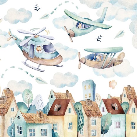 Met dit Helikopter en vliegtuig behang I creëer je een super leuke kinderkamer.