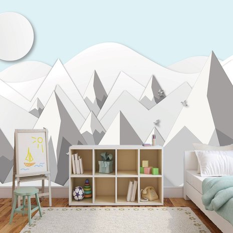 Geef de kamer een leuk accent met dit Kinderkamer behang Bergen in mooie rustige kleuren.