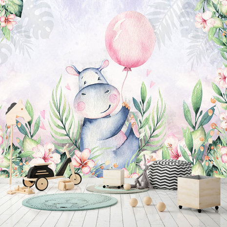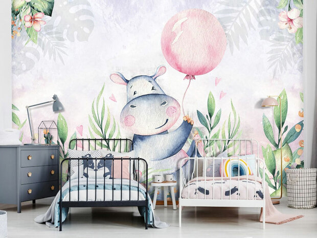 Helemaal van nu is dit schattige Nijlpaard fotobehang voor de kinderkamer. Het design heeft mooie kleuren en geeft de kamer een vriendelijke, zachte uitstraling.