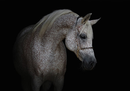 Op dit Paarden fotobehang staat een prachtige schimmel afgebeeld op een zwarte achtergrond.
