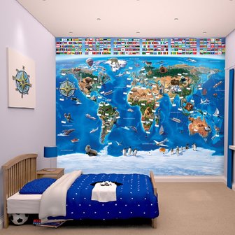 Met dit Wereldkaart behang vergeet je nooit meer dat ijsberen op de Noordpool wonen en de pinguïns op de Zuidpool! Ontdek de wereld, reis mee naar alle landen van de wereld en maak kennis met de dieren op alle continenten.