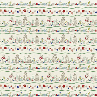Dit Winnie the Pooh behang combineert florale elementen met liefdevol ontworpen Disney-personages, gerangschikt in een harmonieus strepenpatroon. Tussen de lijnen van bloemen en grassen staan Winnie en zijn vrienden afgebeeld. Een perfecte keuze voor een leuk Disney-accent in de kinderkamer.