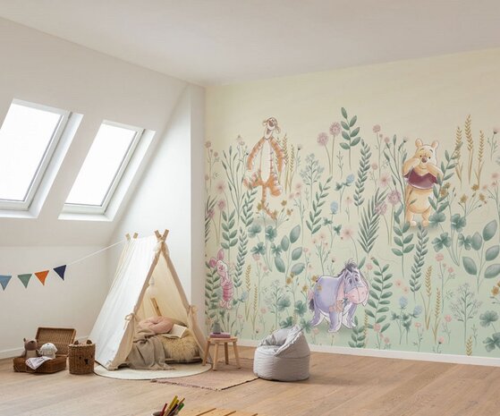 Op dit Winnie the Pooh behang spelen Winnie, Knorretje, Iejoor en Teigetje verstoppertje in het hoge gras.