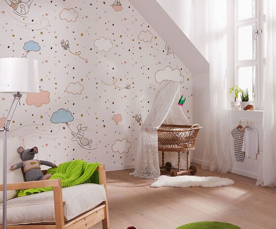Op dit Winnie the Pooh behang is het een winderige ochtend en vliegen Winnie en zijn vrienden tussen de wolken door hoog de lucht in.