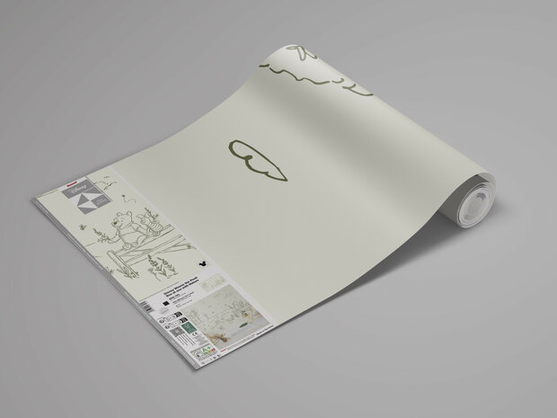 Op dit fotobehang zijn Winnie de Poeh en Knorretje getekend in simpele, fijne lijnen, wat het een charmant, met de hand getekend karakter geeft. Het schattige ontwerp met honingpotten en kleine planten en de rustige kleuren creëren een kalme en nostalgische sfeer.