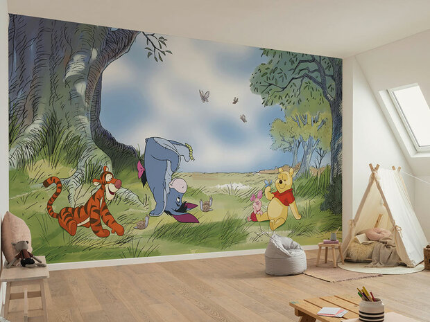 Op dit Winnie the Pooh fotobehang zijn Winnie, Teigetje, Iejoor en Knorretje samen in het idyllische Honderd Bunderbos. Omringd door weelderig groen en een kalme sfeer genieten de vrienden van een zorgeloos moment terwijl vlinders op de achtergrond dansen. De warme kleuren en mooie illustraties geven de kamer een gevoel van harmonie en vriendschap.