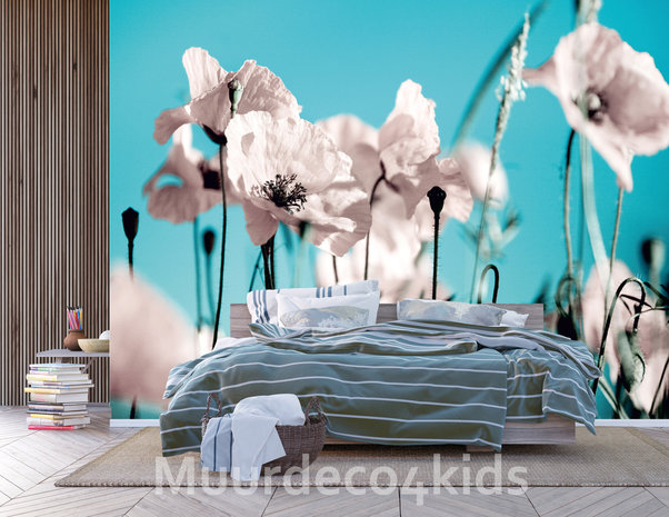 Dit fotobehang met prachtige Witte klaprozen op blauwe achtergrond geeft de ruimte een frisse uitstraling.